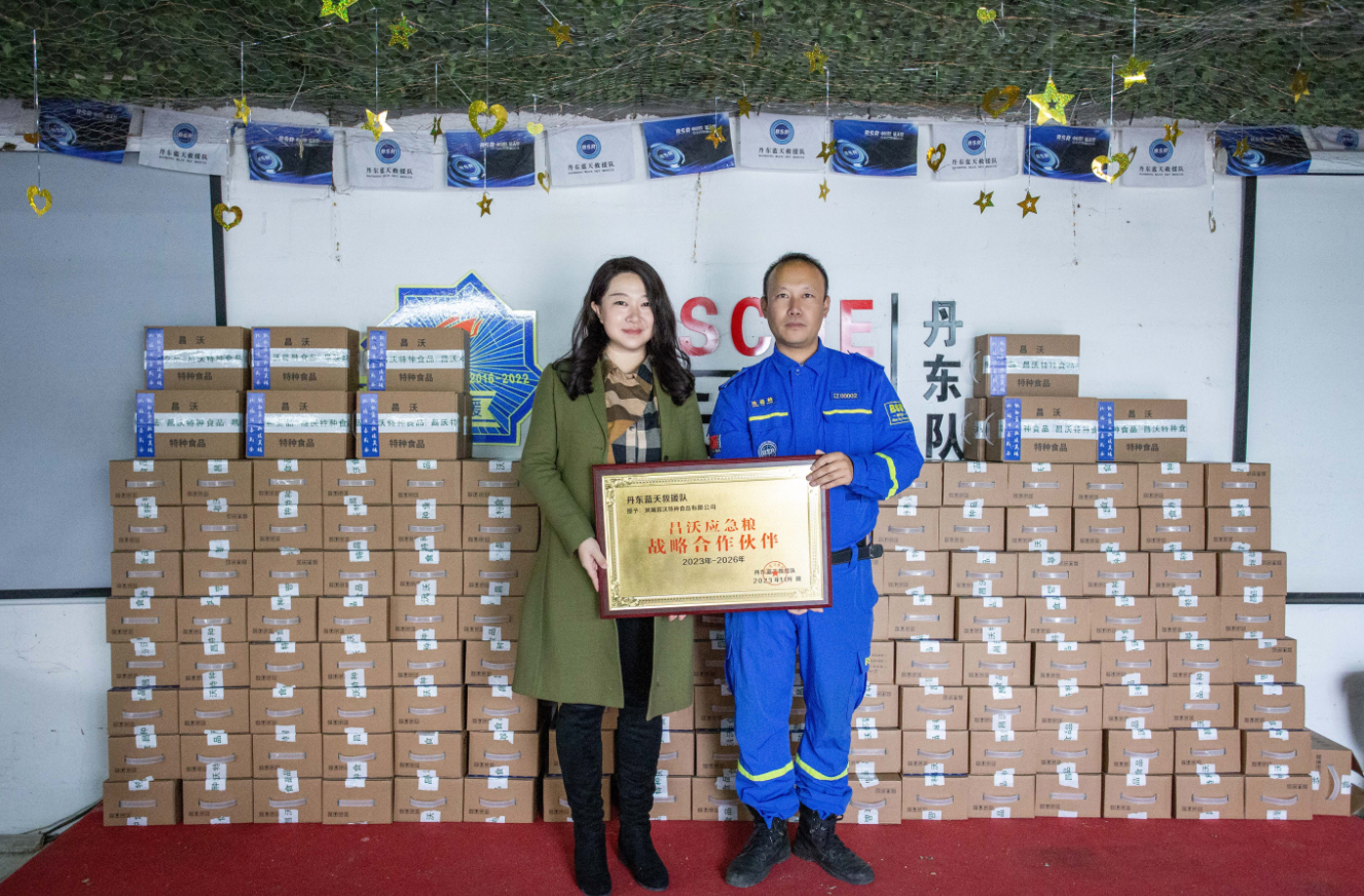簽約儀式后,鳳城昌沃特種食品有限公司為丹東藍(lán)天救援隊(duì)捐贈(zèng)不添加防腐劑并能常溫儲(chǔ)存10年的應(yīng)急儲(chǔ)備食品,希望隊(duì)員們有救援任務(wù)時(shí),特別是在野外作業(yè)時(shí)能吃上一口熱乎飯。